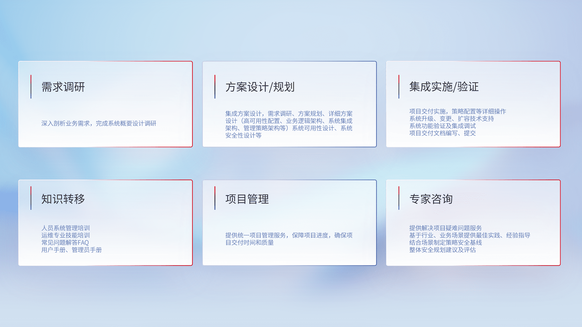 针对客户行业特性,,将宏观的安全战略和需求,,通过专业的交付服务,,,实现项目落地,,为客户提供标准规范的集成交付服务。。
